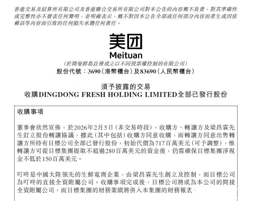 即时零售行业迎来平地一声雷。2月5日傍晚,美团于香港联交所发布公告,将以约7.17亿美元的初始对价,完成对叮咚买菜中国业务100%股权的收购。